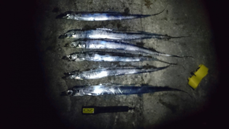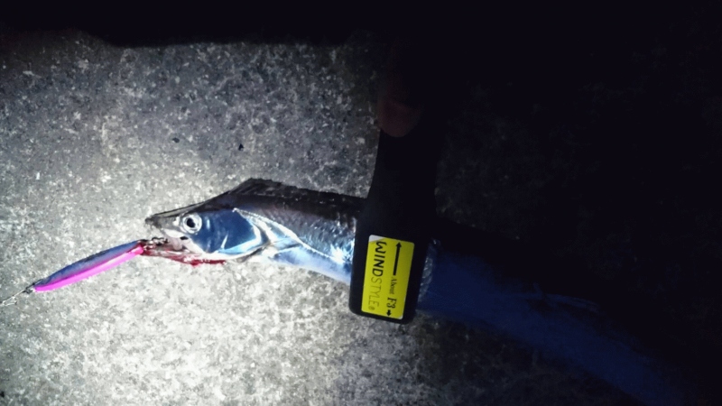 すると、七時ごろを境に海面におびただしい数のベイト!もはや多すぎて糸に常に引っかかりタチウオのアタリを拾うどころではなくなります。