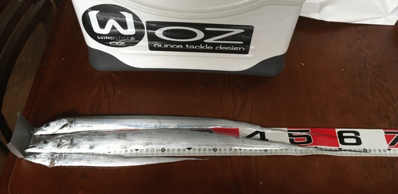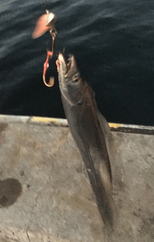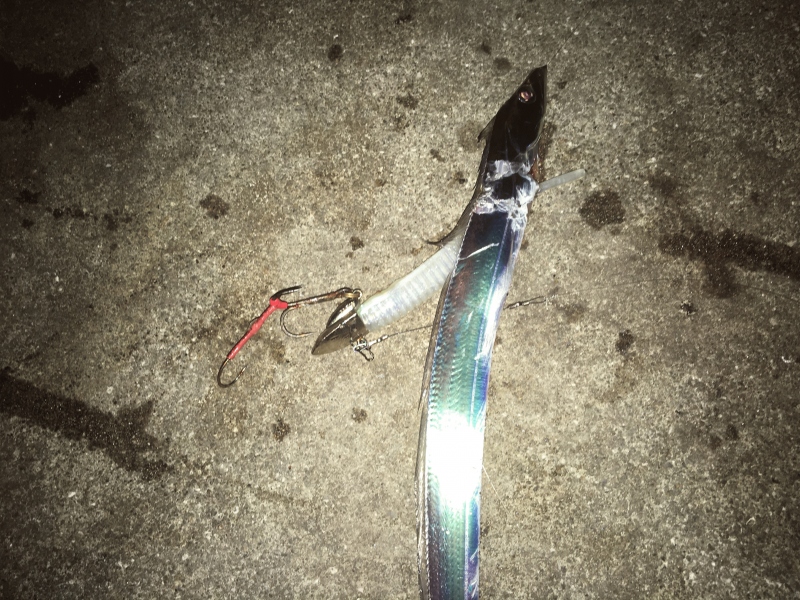 浮きの動き、正直言ってシブいです。1~2箇所ピンポイントで浮きが入っていました。私の場合は、周りも動いていません。ピンテール、パールホワイトでカウント10からノーマルなダートです。直ぐにドン!手前で痛恨のバラシです(涙)その後直ぐにドン!今度は確実に乗りましたが、テンションが無くなって、またか?と、シャクルも何か違和感があり、回収して、今まで見たことのない超小型タチウオが来ました。その後は、シブいながらも、白みかけた頃にMT-90KPFてメインフックにガッツリ(^o^)