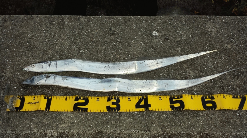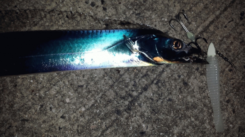 すると中層あたりで久々の良い当たり!!3釣行ぶりのタチウオをゲットしました。グローで当たったので他の色も試しましたが結局この日はグローのみが当たりました。