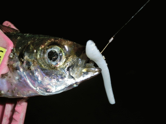 こんな夜はアジも沈んでいるだろうとダウンショット1.3g+マゴバチ01.パールホワイトで開始。