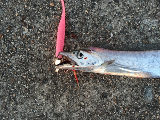 この傾向から、以前に浦さんが言っていた、「ワーム幅は太いので、今の時期のタチウオで口を使わないのがいる」との事を思い出し、ピンテール(#KPF)に変更するとドンピシャ!