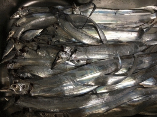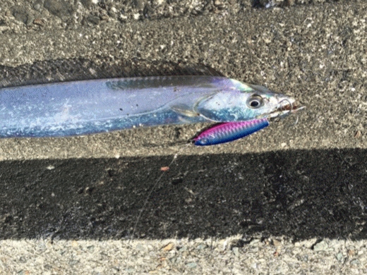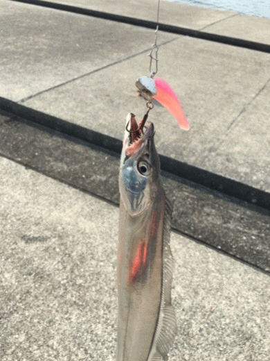 釣り場に着き、大きめのアジが釣れているという事で、沖をZZ-STAPのブルピンで探ろうとキャストしフォールさせた1投目でヒット。運良くアジが来たかと思ったらタチウオ!まだまだ日も高い状況ながら高活性な様子。ここから連発。当たりが無くなるとカラーをかえるとヒットします。明確な時合いは夕方の5~6時。タチウオジャンプこそ見えませんでしたが、マナティーをキャストし着水後、表層付近を数回ダートさせてのフォールでガツガツヒットです。小型のタチウオが多い為バラしやミスバイトも多いですが、まさに入れ食い状態。これしか反応無いというカラーは無いと感じましたが、ピンク系に反応が良かったです。久しぶりにワインドででのタチウオの当たりは何度味わっても気持ちよすぎですね。