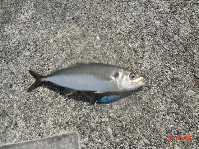 またまた、タチウオ釣行へ、午後3時すぎに釣り場に着くと、タチウオが釣れてます。えらいこっちゃとマナティピンテールパールホワイト、ZZヘッド8分の5オンス、を投げますが、釣れるもののまわりのメタルジグの方が、距離のせいかよく釣れてました、そこでZZ-STAP20g、シャイニーブルーを投入、でも、僕は前からメタル系が苦手でほとんど釣ったことがありませんでした。「やっぱり釣れんのかな」思いながら、投げてると、中層から巻き上げで当たり、タチウオや思いながら、巻いてくると、結構な引き、なんと大きなアジが、ルアーではマメアジぐらいしか釣ったことなかったので、びっくり、後で測ると、30センチ越え、初めてメタルジグでアジを釣ったので感動しました。
