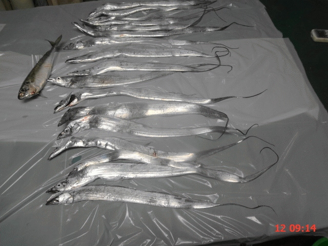 後はとにかく時合の時に、僕でも投げて届く距離にタチウオが近づいてから、マナティピンテールを信じて投げるしかないと思い、午後7時前くらいに大将が「ワインドでも他では釣れてるよ」というのを聞いて、マナティピンテールスーパーグローへ、チェンジ、カウント10くらいまで沈めてる時に、当たりが多く、7連発を含む、15匹でした、