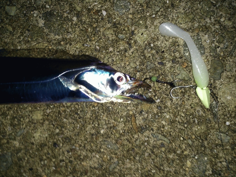 西流れに変わり、バッグの中に昨夜ヒットしまくってボロボロになったピンテール ケイムラ・ピンクファントムがあることを思い出し、ちゃんとアクションしているのかと心配しながらシャクっていると防波堤の近くでF2がヒット。(リリース)