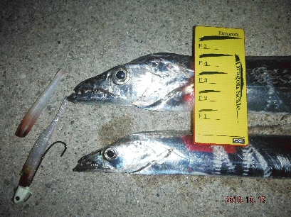 かなりの重量感、どうやって引き上げるか考えていると、急にゴミが暴れだし?ゴミが?暴れる?引っ掛けたのはゴミではなくタチウオでした。魚とわかった瞬間、リールを巻く手が慎重になり、バラさないように・・・締め込み方からして、大型であることに間違いなさそう。絶えて絶えて何とか抜きあげに成功したのは、ジャスト100。久々のメーターでしたが単発で終了。(でも嬉しい1匹)