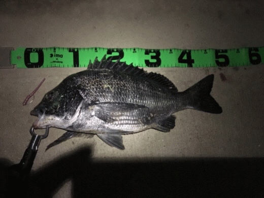 釣り場はランニングする人が多く、コンクリートの護岸が広く釣りやすい場所。水深は満潮の最大で1.5~2m。2~3m沖に捨石やゴミがあり、その川の流れからみて左右がヒット確率が高いポイントです。ただ、明確に魚が溜まるポイントではない為、護岸に沿って移動している個体をひろいあげる待ちの釣り。当日は雨上がりですが濁りは薄いのでCB3-16プラムを使用したテキサスリグで川上、川下の両方から底をとって軽くアクションを入れ浮かせてを繰り返しながら探りますが反応無し。そこで少しシルエットを出そうと別名ソーセージのナチュラルに変更。川下に遠投し、そこを取りつつブレイク付近で早めにリールを巻いてCBを泳がせるとゴンっと当たりがあり、急いでフッキング。ロッドからナイスサイズなのが感じられたのでさらに合わせます。ゴンゴンとロッドを叩いてきながら上がってきたのはマチヌ。サイズも自己記録となる48cm。タチウオが接岸して来ましたが、まだまだ河川も面白いです。(写真は、ワームがファイト中に飛んで行ったので予備を横に置いて撮影)