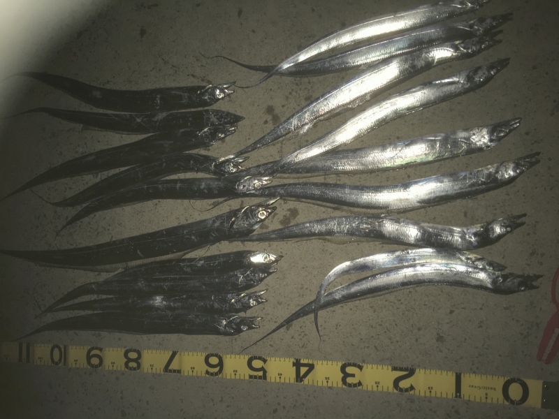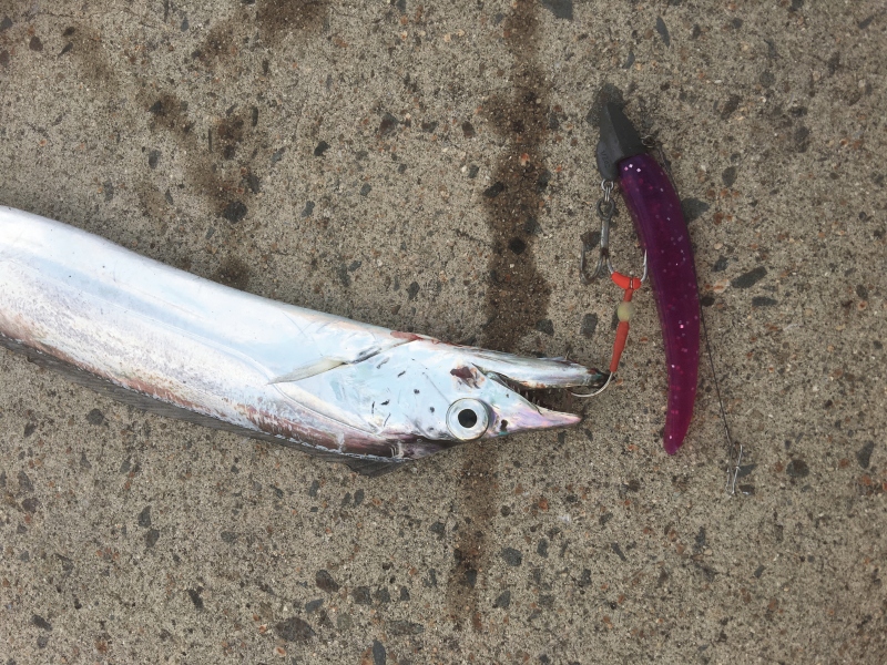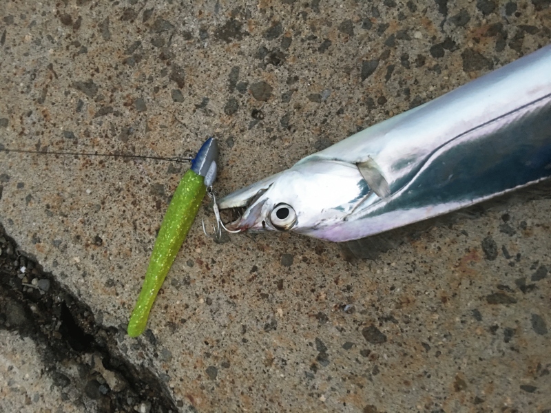 今日は早めに17時前に到着したがさすがみんな情報を聞きつけてほぼ満員状態。ちょうど釣り友が来ていたので間に入れてもらい最初は王道のマナティーのケイムラブルーファントムを1/2のzzヘッドにセットしボトムから狙っていきます!釣れだしたのは17時半ごろ、ポツポツと辺りが太刀魚をあげていきます!そんな中私はノーバイトで全く反応なし…釣り友もどんどん太刀魚を釣っていく状況…何がダメなのか?と一旦考え釣れている人を観察するとどうも着水後10秒フォールからのスローテンポのワインドで釣果をあげています。すかさず真似をすると一投目からヒット!そして続けてヒットと一気に5匹ほどゲット。そこから少し渋くなりカラーをSPチャートに変更した途端当たる当たるの入れ食い状態!一投一匹のペースでどんどん釣っていきます!そしてボトム着底から3しゃくり目でガツンとヒット!本日も出ました90センチ良型ゲット。今日の当たりカラーは完全チャートで釣り友四人中三人がチャートで爆釣!一気に辺りと差をつけることが出来ました!