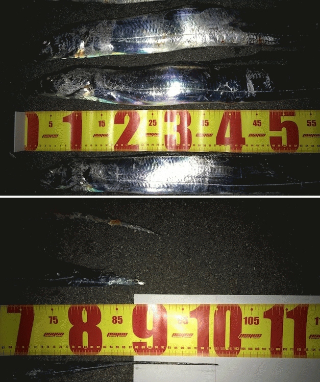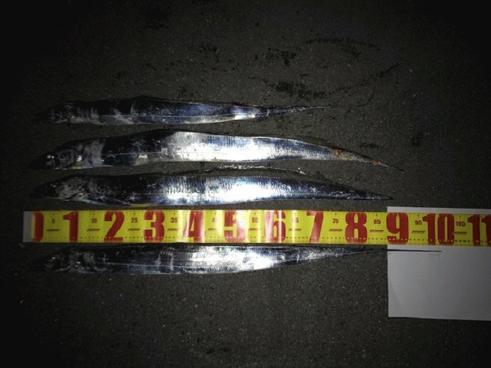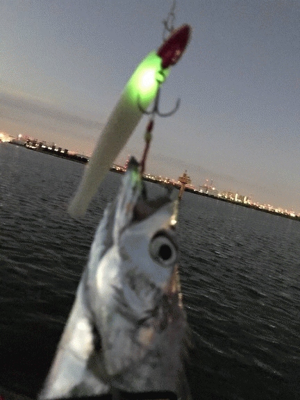 そして、本日はスタートからドラハンをテストしてみました。スタート直後の、17時過頃にショートバイトがありシャクり過ぎなのか?ヒットに持ち込めず・・・ケミチューンしてみる事に・・・(ケミは25mm使用)小さいアクションで誘うと、ZZヘッド1/2+ドラハン(MT-1)でF4クラスがヒット!アクションをさせないでスローにリトリーブするとすぐF3クラスがヒット!「全くシャクらない方が今日はいいのかも?」と思い、その後、同じ様に下層をスローにリトリーブするだけでF4クラスを2匹追加できました。F4クラス3匹の内、1匹は一番細く1mジャストでした。2匹は尾尻が全くなく、メーターに届きませんでしたが私の中ではドラゴンクラス(尾があれば1m超)と言う感じで、F4クラスを3匹キャッチでき本日、初めてDRAGON HUNTが答を出してくれました。私的には「大きなタチウオは俊敏な動きを嫌う」イメージがありDRAGON HUNTは、存在感だけでも十分アピールできているので、「スローで見せる」が、効果的に感じました。