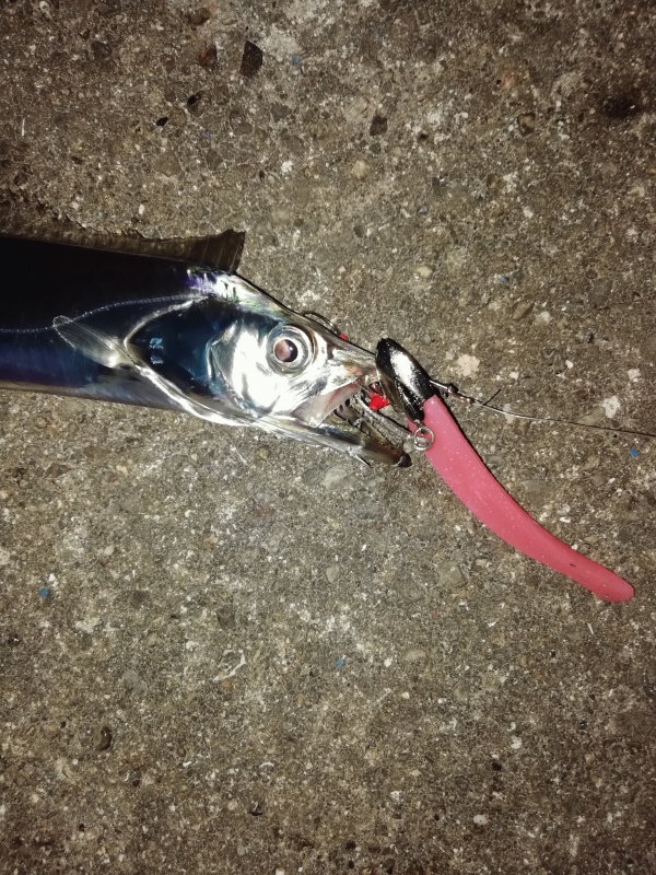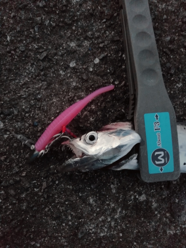 ファーストヒットは17時頃ZZヘッド1/2ozプラスマナティー90(K21)で表層でキャッチ。ピンテール105(K21)に変更し2匹追加したあとタチカッターの餌食に。時合後はフラップヘッド3/8+ピンテール105(K21)に変更しパラパラと追加できましたが、サイズアップには至らず最終釣果8匹でストップフィッシングとなりました。