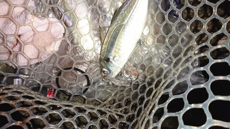 フロートリグにマゴバチしらすをセットし遠投。少し巻いてきた辺りでコツっと心地いい当たりを合わせるとナイスなアジ!