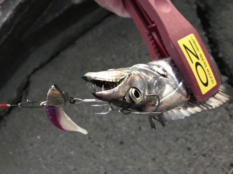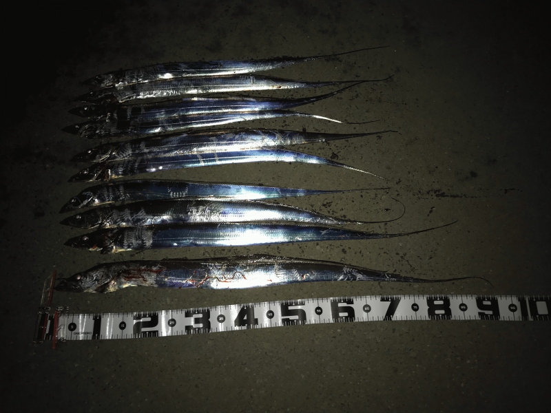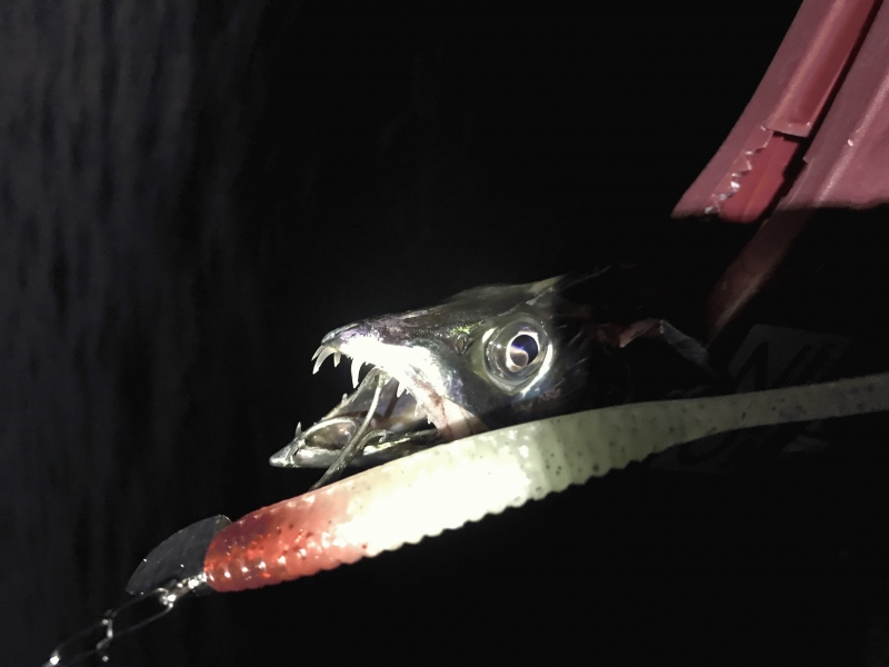 ジグではノーバイト、どうなるか思ったら今日はタチウオタイムがズレてワインドに高反応、マナティーピンテール、パープルバックでヒット!反応が鈍くなり、レッドヘッド!ポツポツと拾い後半は、ショートバイトが続いてなんとか2桁ヒット!