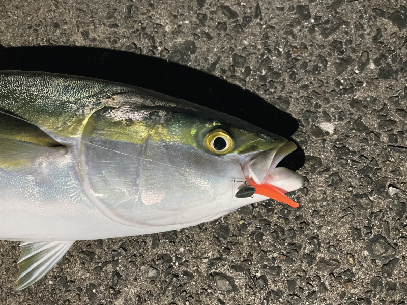 その2投目でした。着底からの3回しゃくり上げ、フォール中に明確なアタリとともに合わせを入れた瞬間ものすごい勢いで出ていくライン。目の前の水面にはボラの群れが泳いでいたので「やってしまった・・・。」と思いながらもPE0.3、リ-ダ-1号のライトワインダーでやりとりを楽しむ事にしました。