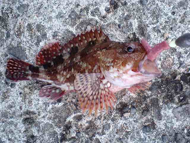 キジハタにはまだ早いがカサゴなら十分狙える時期になったので今朝は根魚狙い。横風が強くラインが流されボトムが取り辛い状況のなか、風と潮の流れを読みながらリグを沈めて行きます。なかなか狙い通りにポイントに入ってくれずイラ付き始めるとコン!。う~ん、この当り癒されます。ゆっくり目のリフト&フォールで狙いのポイントまで持って行き、バンピング後のステイでコツ!。何度味わってもこの当たりはたまりません。次はフォール中にコン!。今度はモゾモゾ。サイズは小さかったが根魚特有の当りを堪能し十分癒されました。