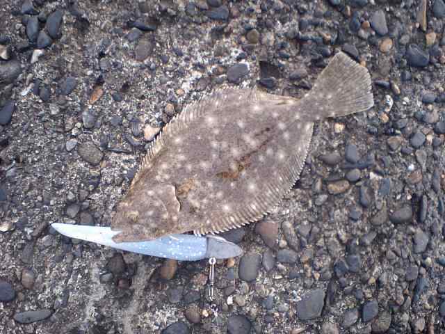 今日で連続釣行がなんと30日になってしまいました。バカと言うかアホと言うか救いようが有りません。そんな記念すべき?30日目のターゲットは砂物。ボトムを意識しながらやんわりワインドを繰り返すが全く反応無し。ま~そう簡単に釣れる訳も無いから...とポイントを移動しながら探り続けるが当たりすら無し。カラーをK3に換えた1投目でコツっと極小の当り?。釣れたのはちっちゃなソゲくん。90サイズのマナティーに果敢にアタックして来たのか、それとも引っかかっちゃたのか...。その後は沖で出ていたナブラが次々と近寄ってきます。無視するわけにもいかずキャストを繰り返すが相変わらず反応無し。ナブラの中心部を外し端の端をこれでもか~と言うくらいのしゃくりで狙い続けてようやくヒット。サイズは小さいものの狙い撃ちのヒットは楽しいです。作業船が近づいて来るとナブラも消えてしまい静かな海に。結局、本命は釣れずに終了です。