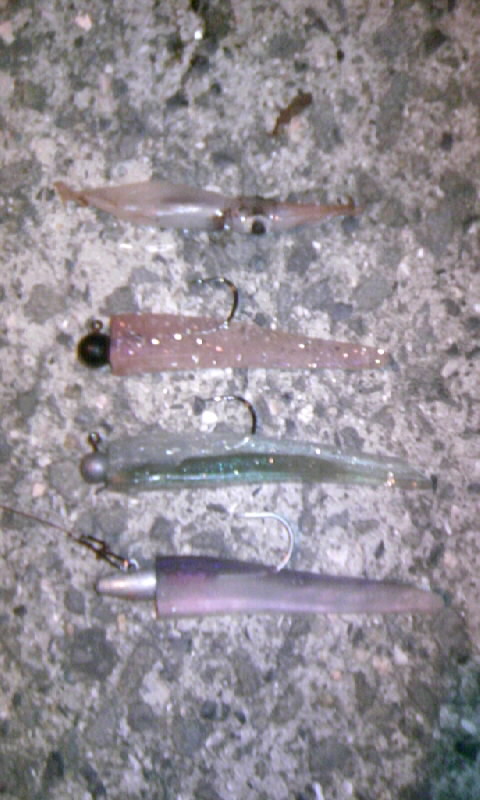 神戸港は、バチからスルメイカへのベイトの移行期であります。バチ抜けシーバスには“カッティングベイト3インチ”が最強だと思っておりますが、ではイカは何が…。私が数年前からやっております“マナティーDeイカパターン”を仕事あがりの短時間やってまいりましたので報告いたします。急に釣行が決まったため、この釣りに合うマナティーのカラーやサイズは代用です。今の段階ではスルメイカのサイズは6~7cm。わざわざ同じサイズにしなくても大丈夫なのですが、あまりマナティーをデカくしてしまうと、シーバスが食いきれないようなセッティングになりますので、手持ちの75を60くらいにカットです。ジグヘッドはフォールでのバイトの加減を見るため、3gあたりと5gあたりの2種類。キャストして、まず“ちょっとだけ”フォール(ここで食ってくることもあります)。で、ラインスラッグを“出し過ぎない”ように注意して、“ひょ~い、ひょ~い”とロッドを動かしてやります。シャクリではなく、30cm~50cmほど竿を二回ほど浮かせてやる感じです。その後、あまったラインスラッグをゆっくり巻き取りながらロッド操作でフリーにフォールしてやります。この繰り返しです。ただこのやり方、ワインド同様、フックセッティングは言わずもがな、ラインスラッグの使い方がかなり繊細になります。出し過ぎもだめ、出さなさ過ぎもだめ、です。スラッグが多過ぎると、動きが多き過ぎるのと、アクションのすぐ後のフリーフォールの際、バタバタしてしまってアタリ取れません。逆に少な過ぎると、アクションが機械的になり、さらに後のフォールですぐにテンションが掛かってしまいます。今年初のイカさんシーちゃん、仕事明けの一時間半で6つは私にとっては上出来でした。でもやはり私はシーバスより根魚様が好きです。笑