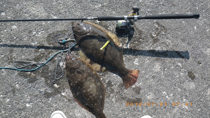 その瞬間ヒラメが見えましたギュンギュン引きましたが素早くキャッチ!タモの中でフックアウト、(ヒラメの場合これが多い)