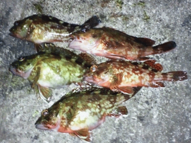 カサゴ狙いで行ってきました。物凄く食べたかったので(笑) 敷石のカケアガリ狙いです。産卵前の荒食い時には派手なカラーに実績あり、マゴバチのカラーは04を選択。出来るだけ根掛かりを避ける為、軽めのジグヘッドリグを着底と同時にバンピングとストップ&ゴーのアクションで探りを入れるとヒット!根に入られないように一気に中層付近まで浮かせてからキャッチしたのは産卵を控えた重量感あるプリプリのメスカサゴ。とりあえずバッカンでキープ。その後も根掛かりを恐れず(実は怖かったです)タイトに攻め、連続ヒット。アタリが遠のいたところで写真撮影後、メス3匹はお帰りいただき終了しました。自然保護は大切に。
