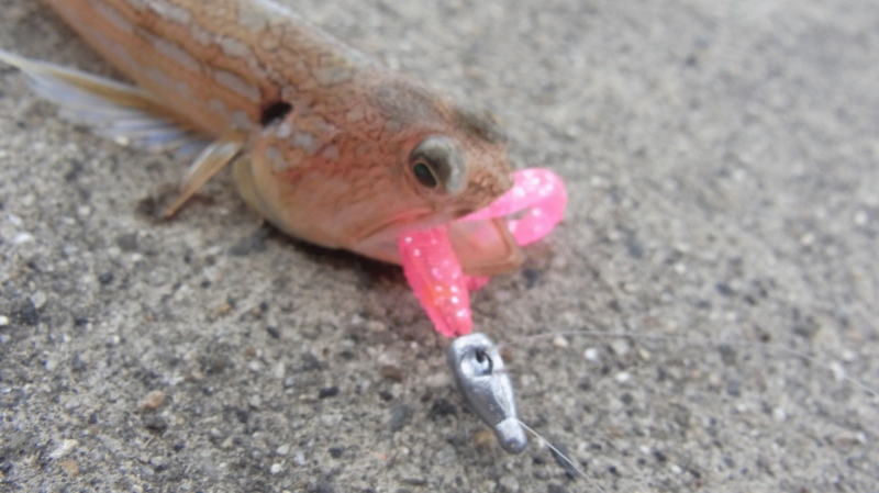 撒かれているはずなので苦しい展開を予想、軽めのジグヘッド選択しCutting Bait 2inchに02シラスをセット 流れに馴染ませるように丁寧に操作していくと、いきなりロッドが曲がる、いつも20cmくらいの奴しか釣ってないから外道???と感じたが、正体はアジ、30cm越えのいいサイズです、その後は色々と試行錯誤してみましたが、MAGOBACHI 09.ピンクグリッターでエソ一匹のみで終了。ディでも尺アジを獲れる事がわかったが再現性はあるのか?今後の課題です。