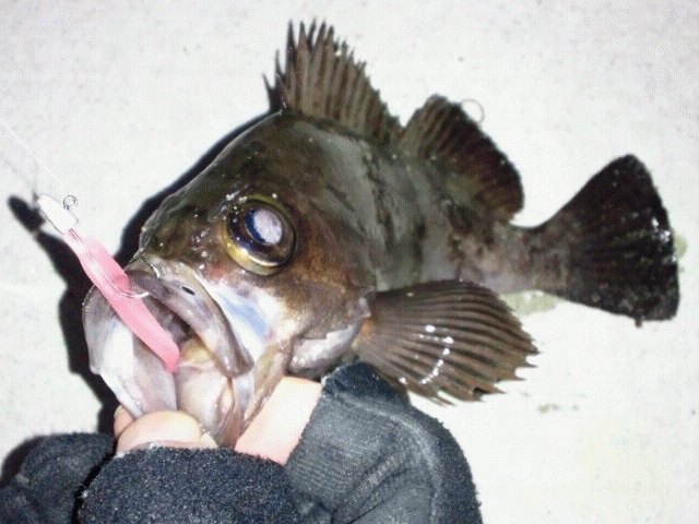 例年この時期のメバルはピンク系カラーが効果的。アミパターンですか? 今日はラン&ガン作戦で。 一ヵ所目、常夜灯下に群がるメバルを確認、まずは表層に浮いているメバルをマゴバチK-01&09で狙い撃ち。数匹釣ると小メバルいじめの代償に最後の09取られた...その後はアタリなくなり場所移動。 二ヵ所目はアタリはわずか一度のみで時間の無駄なので早々に見切り次へ移動。 三ヵ所目、手前に寄せて来る嫌らしい流れでしたが底周辺を狙い、フォール中まずまずのサイズがヒット!激流の中でのファイトは釣り味抜群! 二日前の大雪の影響か?昨日は河口メバルに行きボウズをくらい、今日は時間をかけたわりには好釣果は望めず、イマイチ癒されなかった月夜であった…(笑)