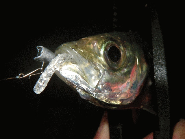 何となくロッドから違和感を感じ、まさかと思いつつも聞き合わせをいれると、20cm程度のアジがヒット。