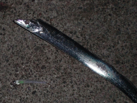 タチウオを誘う意味も込め、風対策として大きくシャクりフォール中にラインを調整してまたシャクるを繰り返し終了間際に1匹追加です。