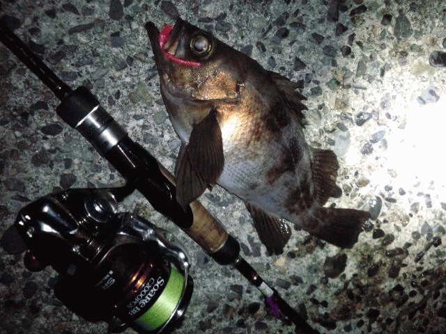 超スローリトリーブで早合わせは禁物の様子。月灯りが海面を照らし始めたのでラメ入りのピンクグリッターに交換すると反応が良くなり良型メバルをゲット。