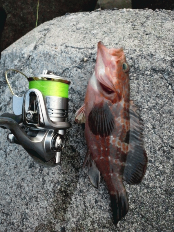 最近になって根魚の釣果があがってきたのでメバルとの2本体制。しばらくはコバチを付けていたが遠投して狙いたかったのでカッティングベイト3インチを付けてキャスト。根を探しながら叩いていくと、モゾっとヒット(≧▽≦)しかしながらあたりが続かないのとあたりはあってもイマイチやる気がないのか乗らない(>_<)
