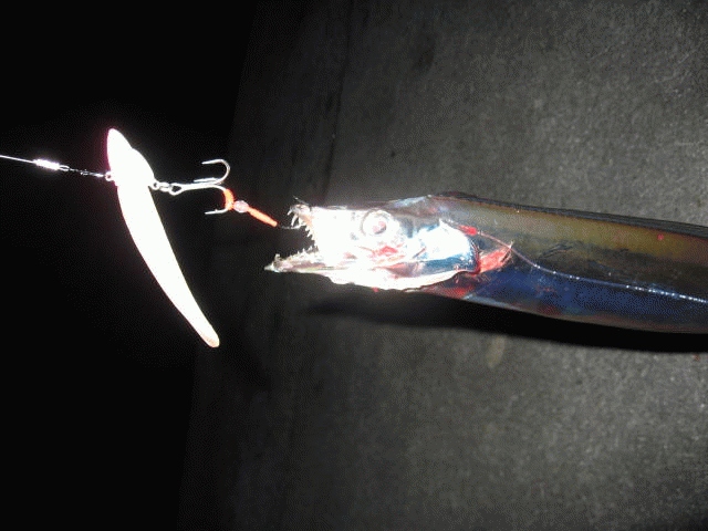 足元をタチウオの群れが通りすぎるのが見えた瞬間にヒット。