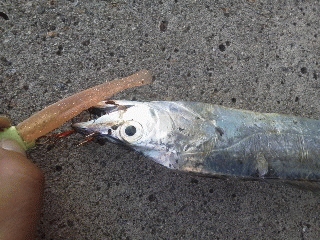 朝まずめ、まだ暗いうちから竿をだし数投目、ガツンというあたりが・・・いきなりの大物、指三本半ちょいあるサイズがつれました。その後も小さめではありましたが、3本あげて合計4本。