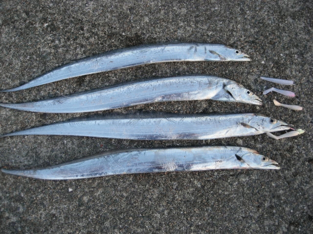 かなり気温が低くなってきましたが、早朝の南芦屋浜へ釣行しました。ZZ-HEAD1/2、MT-K02で中層付近を探っていると反応はありますが、ショートバイトの連続!で、なかなかHITに持ち込めません。そこで匠魚TK-01に変更し同じポイントへ投入すると1投目からHIT!!90CMの良型でした。その後すぐ様1匹追加し、激しく損傷したTK-01からTK-K02に変更するやまたまた会心のアタリが続き、結果匠魚で4匹ゲットすることができました。スローなシャクリの後のフォール中に良くあたりました。マナティー同様匠魚の威力も絶大です。