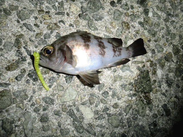 今日も仕事帰りにちょこっと寄り道。今日はカッティグベイトだけでやってみました。リグは他のモニターさんのマネして2Bのガン玉のスプリットショットで。良く当たるですが小さいのかフックアップしない・・・けど小さくカットせず2インチのままで行く ワイルドだろう~(笑)アタリがあったら止めて持って行くのを待ってから合わせる事数回・・・やっとフックアップ出来たのは小振りなメバル。ピンクグリッターから開始して反応が無くなればSPチャートに、そしてパールホワイトにしたらなんか違う手ごたえが?