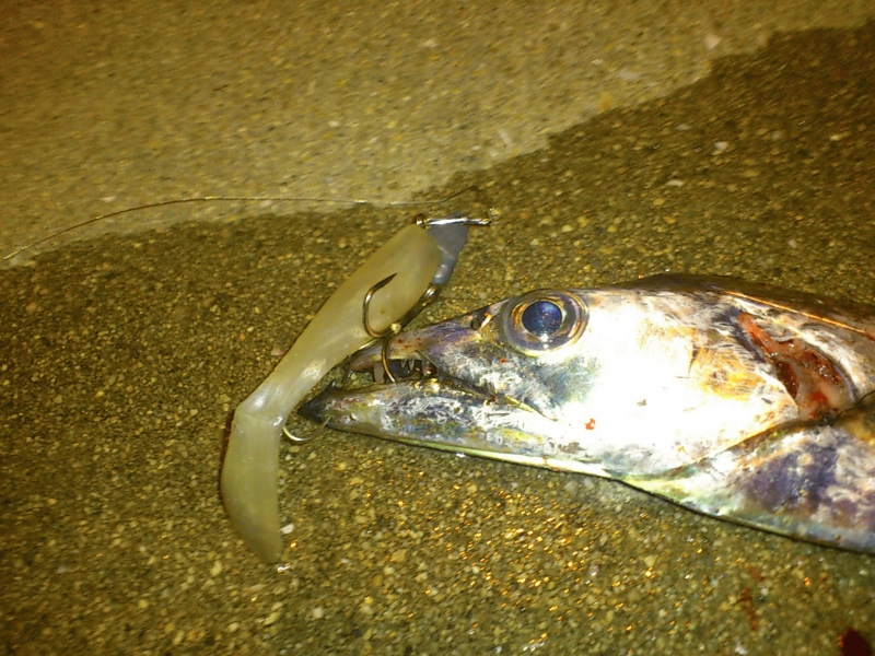 仕事の合間に兵庫突堤へ。まずはマナティーで様子を見ますが無反応。匠魚TK-02 75mmに変えカウント5でタダ巻きしているとHit!しばらくアタリが無く、TK-01で巻いて来ると足元近くで2連発!見える範囲で他の人は0~1匹と渋い中、匠魚は3匹のタチウオをキャッチしてくれました。