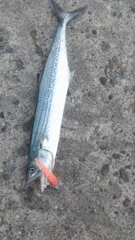 風が強く半分以上車の中で待機してました。風が弱まって第一投・2投と連チャンして爆釣の予感がしましたがすぐまた強風で待機釣り始めるとすぐに掛るので周りの人も見にきました。まだ酒田ではワインドでサゴシは浸透していないようです。風が弱ければもう少し頑張れたんだが・・・・・。