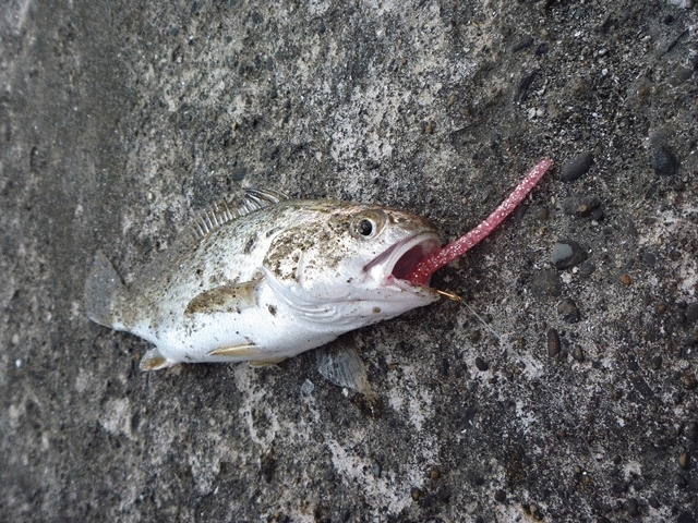 途中誘いを入れながらズル引きしているとブルっとヒット!釣れたのは20cm弱のイシモチ。サイズは小さくても様々な想いによって感動は50cm級・・・。