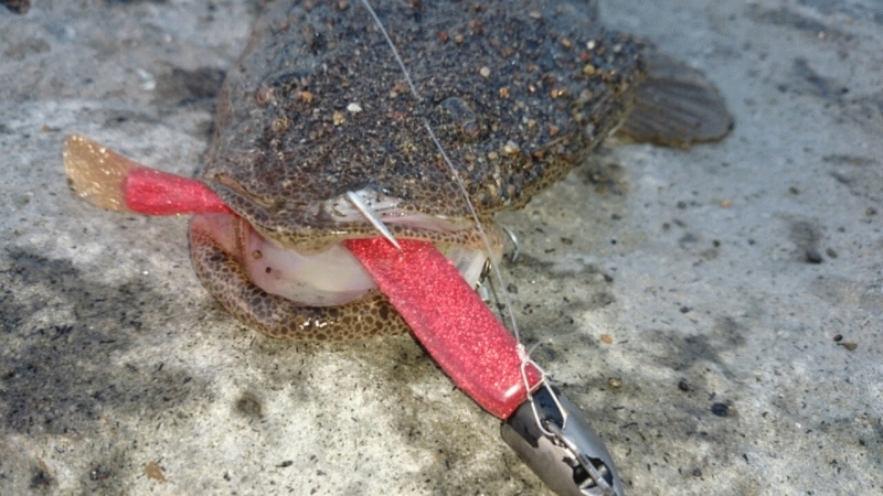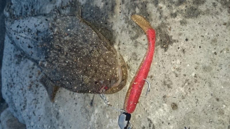 夕暮れ間際ポイントが空き、すかさず移動。1投目のフォール時にコツン!合わせるとなかなかの重量感でマゴチ52!撮影→リリース後、立ち位置をずらしながら3投目の巻き上げ時に強烈バイト、ブンブン首振りするナイスファイトで2本目54(^^)d