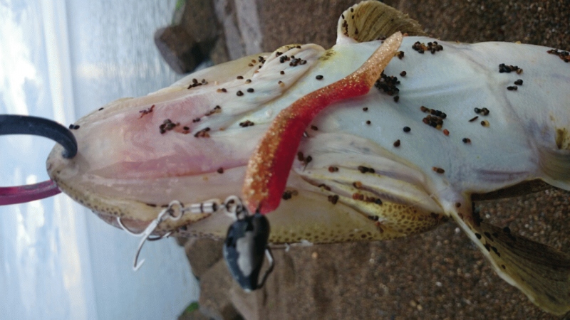 例によってミノー115で探り出すとバイト頻発!しかし乗らない。そこでサイズを90に落としてみると1発でマゴチ45が2連発!引き続きランガンしながら夜が明け、そろそろ引き上げか?と思っていると強烈なバイトと首降り、これはなかなかのサイズ56!!