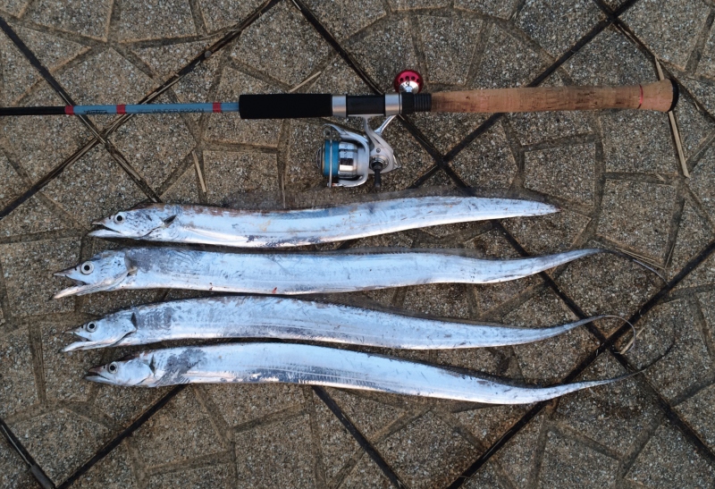 2時30分頃、ZZ-Head3/8にマナティー75MT-01でスローなテンポでやんわりしゃくると根掛かりしたような強烈なバイト!!しっかり合わせを入れて上がってきたのはF3のタチウオ!!