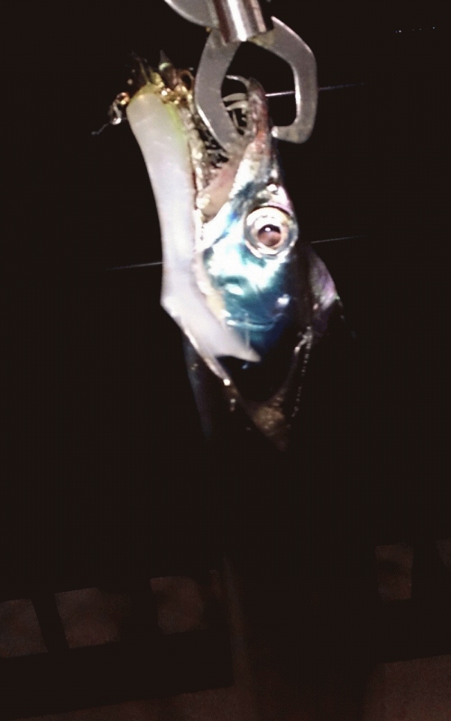 日が上がっていない時間帯なので、匠魚でスローに攻めようとセッティングしました。K2にケミチューンを施し、軽めの3/8のZZ-headで開始。1時間ほどすると、初の違和感。匠魚に噛み跡がありました。追いきれてないと判断し、同じところを優しく、超スローでしゃくると、タチウオの当たりです。指3本強、92.5cmの良形でした。しばらく当たりが無くなり、辺りも少し明るくなったので、1/2のZZ-headに変え、少し遠投し、中層より下からゆっくりしゃくると、違和感。が、抵抗感がなく、ゴミかなと思い巻いていると、大分岸に近づいた所で抵抗してくれました。これも、指3本、93cmの良形でした。明るくなると全く気配がなくなってしまいました。結局、4時30分から5時までの短い地合いでしたが、2本ゲットでき、久々の感触を楽しめました。