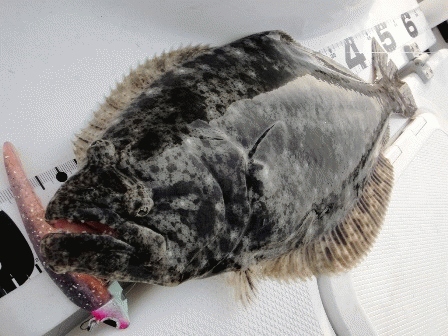 ベイトタックルのラインが引き出され、今季初の緊張感でやり取りを楽しみ、上がって来た獲物は50cm級の良型寒ビラメ!