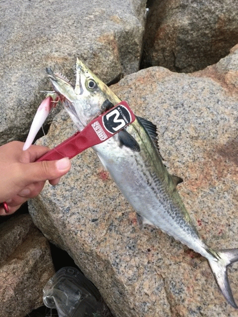 海色はやや濁り気味でしたのでマナティーL-3を選んでキャスト。着水からカウント5で細かいシャクリから少し止めてのフォールさせを繰り返ししてるとドーン!今回、本命のサゴシがHIT!