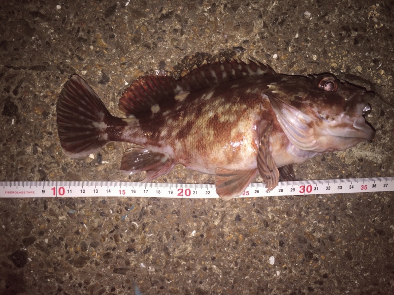 暴風で風裏ポイントを狙っての釣行です。風が巻いてきて、少し風のある状況でキャストして底を取り、ラインテンションを張って小さなアクションをしていると、ゴンっとアタリがでます。合わせをいれて、巻き巻きしていくと、ええサイズのガシラが現れました。この後も、同じようなパターンであげて、風が強くなってきたので終了としました~♪