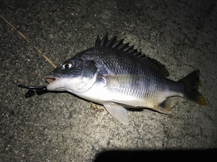 前日までの雨の影響で川の濁りはきつく、草木の浮遊物が多い状況。満潮まで上げ8分といった水位で、川の為もう少し流れがあると思いましたが流れがかなり緩く、魚の反応はあるのか?と思いながらキャスト開始。リグは5gのシンカーを使用したビフテキリグに濁りに強いカッティングベイト3インチのダークスモーク ブルーラメ。岸よりに捨石などの障害物が多い所な為、岸際3mぐらいを川と平行に探るも反応なし。岸より15mぐらいを平行に引くとコツッツとバイトするもフッキングが遅れたのかヒットならず。魚がいる位置がわかったので、次はどの誘いの反応するかの検証。底をズルズルとひくのか、そこからワームを跳ね上げて落とし、しばし放置か、リズミカルにリフト&フォールをくりかえすかなどを色々と試すと、チョンチョンとワームを跳ね上げてずる引きの後のステイからの動き出しに当たりが多く集中。唯一釣り上げた1匹も動き出しで気持ち良くフッキングし、サイズはアベレージでしたが独特の引きで楽しませてくれました。30分ほどの釣行で、1ヒット・1フックアウト・当たり数回でした。今の時期カッティングベイト片手にサッと行ってサッと釣るキビレ釣行おすすめです。