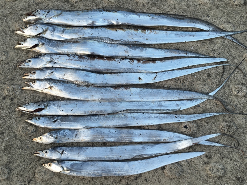 まだワインドでタチウオを狙う前の時代に使っていたスケルトンヘッドが残っていたので、後ろのトレブルフックにサーベルアシストをセットして使用。ケミを仕込んだマナティー90 スーパーグローをセットして、着水と同時にロッドを水平から徐々に立てながら、ダートさせずに直線的に引いて来ると、2匹釣れました。早く、正しいFLAP釣法の映像と専用ジグヘッドの発売が待ち遠しいです。