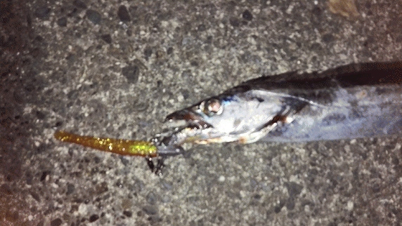 今日も接岸しないのかなと思い、タックルを遠投用に準備していたショアワインダー832KM PLUS+ZZ-Head 5/8ozに変更し今年当たりカラーのレッドゴールド+ケミホタルで開始すると2投目の18時5分に10シャクリ目にガツンと当たり。やはり遠いなあと感じつつ追いアワセを2回入れガッツリ掛けてから引き寄せるとF3、80cm。写真を撮っているとエサ師の方も2本目をこれまた沖合で上げ、時合突入。