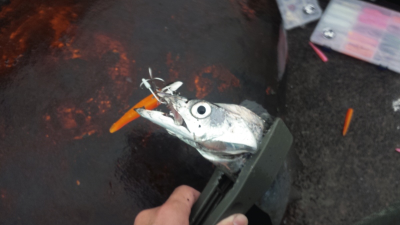先ずは3/8ozフラップヘッド+マナティーピンテール MT-K21でボトムから反応を伺うこと数投目、ピックアップ寸前にヒット!幸先良く1匹目。続いてカウント8まで落としてからのアクション後のステイ時にヒット!2匹目キャッチ。今日は爆釣か?と思いましたが、ここからリズムが狂いだし、フラップヘッドが2連続で太刀カッターの餌食に。ワインドへ変更(1/2oz+マナティー90 MT-08)しカウント5からの連続ショートジャークにヒット!3匹目。MT-K13にカラーチェンジしますが、またもや太刀カッター・・・。自身のリズムは悪過ぎですが、釣り場のポテンシャルに助けられ8時のストップフィッシングまでコンスタントに釣れ続け(MT-05,K21)最終釣果11匹でした。南港Jグリーンまだまだ釣れ続きそうです。
