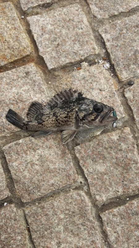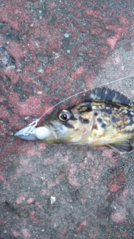 流れは無いのですが風が強いのでジグヘッド1.5グラム+マゴバチカラー02で探ります。岸際をリフト&フォールさせるとアジがヒットしました。その後少し沖に投げて同様にリフト&フォールでその後バイトが無いのでワームをマゴバチカラー19に変更すると着底後にゴンとバイトがありクロソイがヒットしました。その後風が強まりジグヘッド2.5グラム+マナティー38ホワイトヘッドに交換しボトムを攻めるとクロソイがヒットしました。