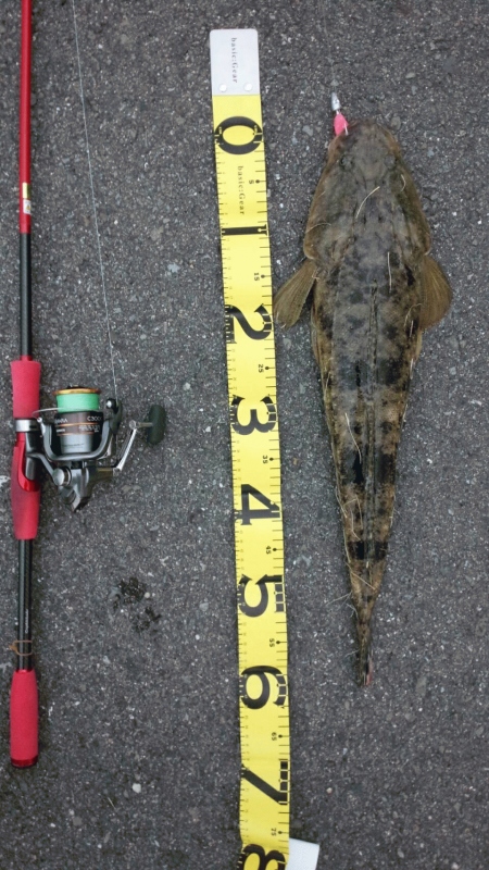 今日は活性が低いのかと思いワインドシャッド75のケイムラマズメピンクをキャスト!そしてゆっくりボトムを意識してただ巻きするとガツン!っと引ったくるような当たりが!これはでかいと思い丁寧に巻いてくるがすごい引き。楽しみながらゆっくり丁寧に巻いてランディングすると約60センチほどのデカマゴチ!