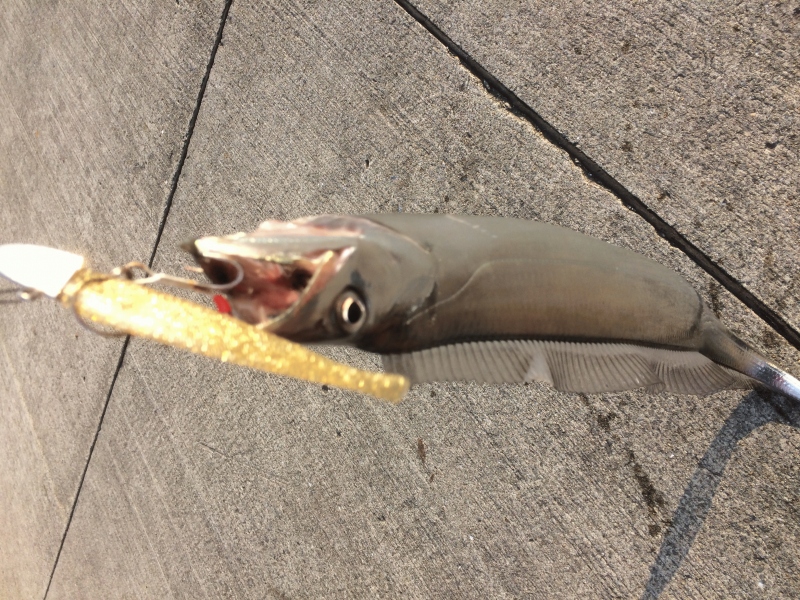 強風の中、ボトムをとりしゃくりはじめ、かなり沖でヒット!すかさず追い合わせを入れて慎重に巻いて巻いて、かなり厚みのある太刀魚ゲット!