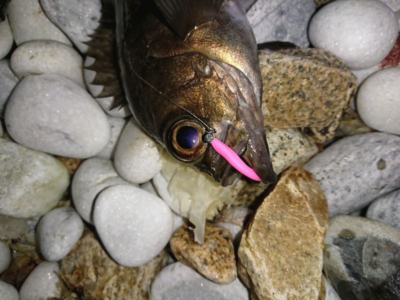 その後、全くアタリがなくうっすら近くの建物の灯りが照していたためマゴバチk1にて探っているとやっとアタリがあり15㎝ほどのメバルがやっとヒット!その後、hlだと思いますがぁファイト中にリーダー途中から切られることもありましたが、01,15にてヒットし潮止まり前辺りで本日最大の推定25㎝のメバルがヒット!